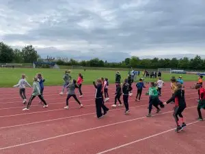 Sportfest (Leichtathletik) der Schule; die deutschen Kinder nehmen als Mannschaft teil